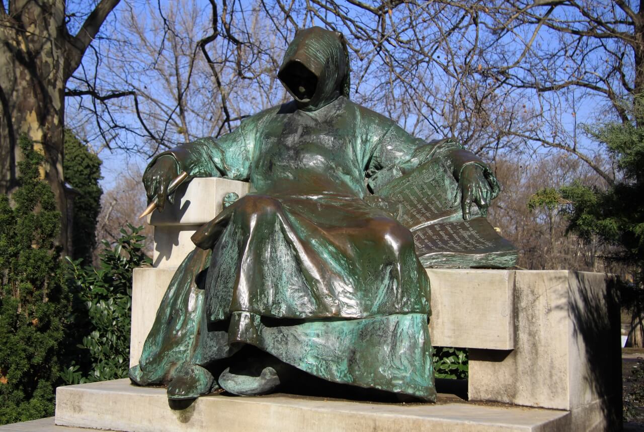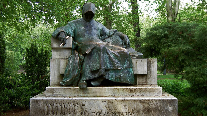 The Anonymous statue was created in Budapest in 1903 by sculptor Miklós Ligeti. The bronze statue, almost two meters high, was installed in the city's Varosliget Park. The seated chronicler holds a manuscript in one hand and a pointed pen in the other. He wears a large hood, but if you look closely, you can see that his eye sockets are empty. This is another legend about the mysterious chronicler, according to which he was blind.
