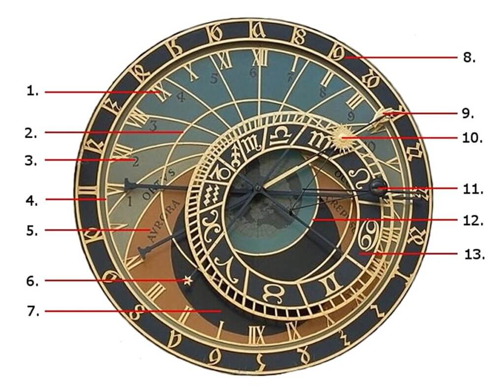 1 – Current time, 2 – equator line, 3 – Sidereal time (Arabic numerals), 4 – Tropic of Cancer line, 5 – Dawn sector, 6 – Pointer with a star, 7 – Night sector , 8 - Old Bohemian time, 9 - Pointer with a golden hand, 10 - pointer with a sun symbol, 11 - pointer with a moon symbol, 12 - zodiac ring.