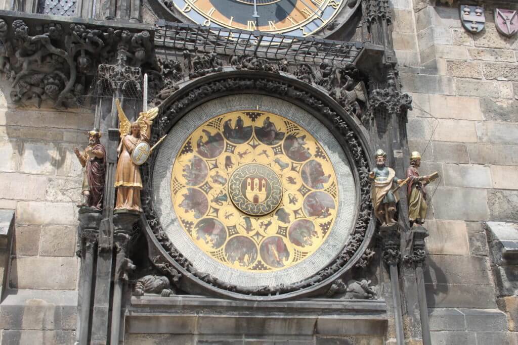 In the center of the dial is the coat of arms of Prague (during the time of King Vladislav II), on the small circle - 12 signs of the zodiac, on the middle circle - 12 months of the year with various images (including the birth of a child, plowing , sowing, reaping, harvesting, etc.), on a large circle. On the circle there are 4-sector 365 partitions. In each section, the number of the month, the letter indicating the day of the week, the names of Christian holidays and saints, and the days of remembrance of saints are written.
