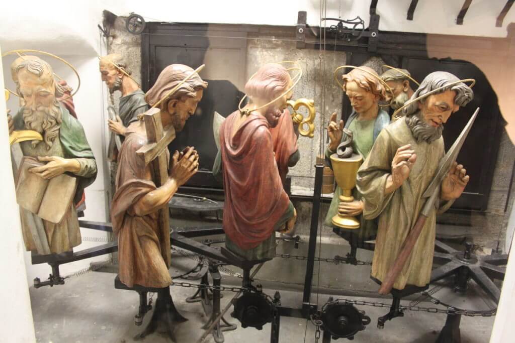 The clock rings every day - from 09:00 in the morning to 23:00 in the evening. At this time, a unique show is organized. Above we mentioned two small windows. The 12 apostles leave one window and enter another window. Jesus ends the procession. At the same time, 4 figures located on the sides of the upper dial also move: the skeleton turns the hourglass and indicates something to the Turk. The Turk shakes his head in refusal. The stingy one will lose the money bag, and the archangel will punish him with the sword as a sinner. At the end of the performance, a rooster is heard crowing.