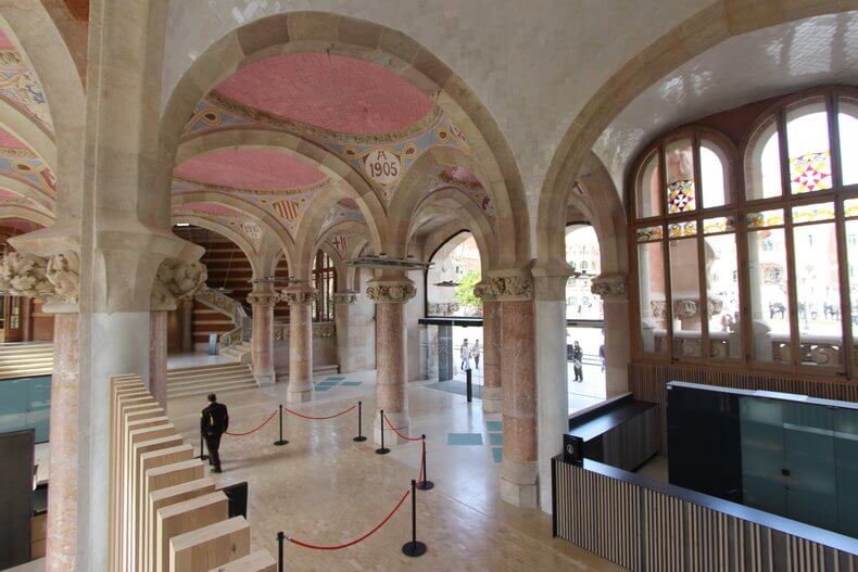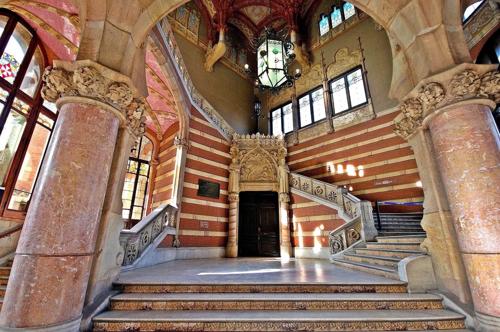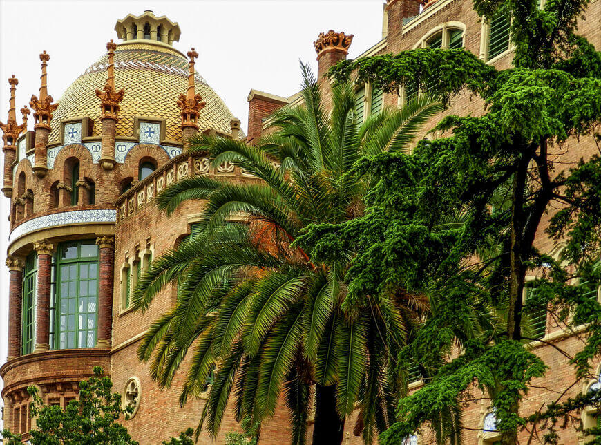 Hospital Sant Pau is a beautiful building with large arched windows, towers, statues, decorative ceramics and stained glass, flowers and tropical plants. With its beautiful interior and exterior, it looks more like a royal residence.