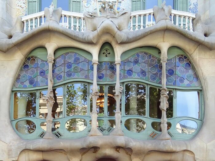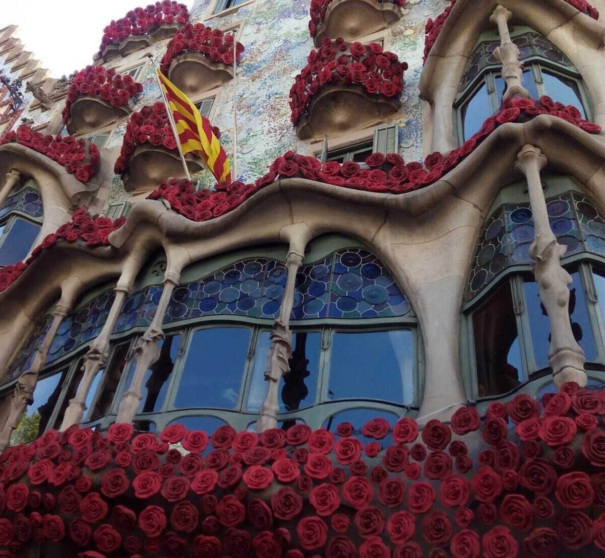 Another distinctive feature of Casa Batllo is that it has no straight lines. On all decorative elements of the facade they are replaced by cladding, wavy and arched coils. Every year on April 23, the facade of Casa Batllo is decorated with roses in honor of the day of St. George, who defeated the monster.