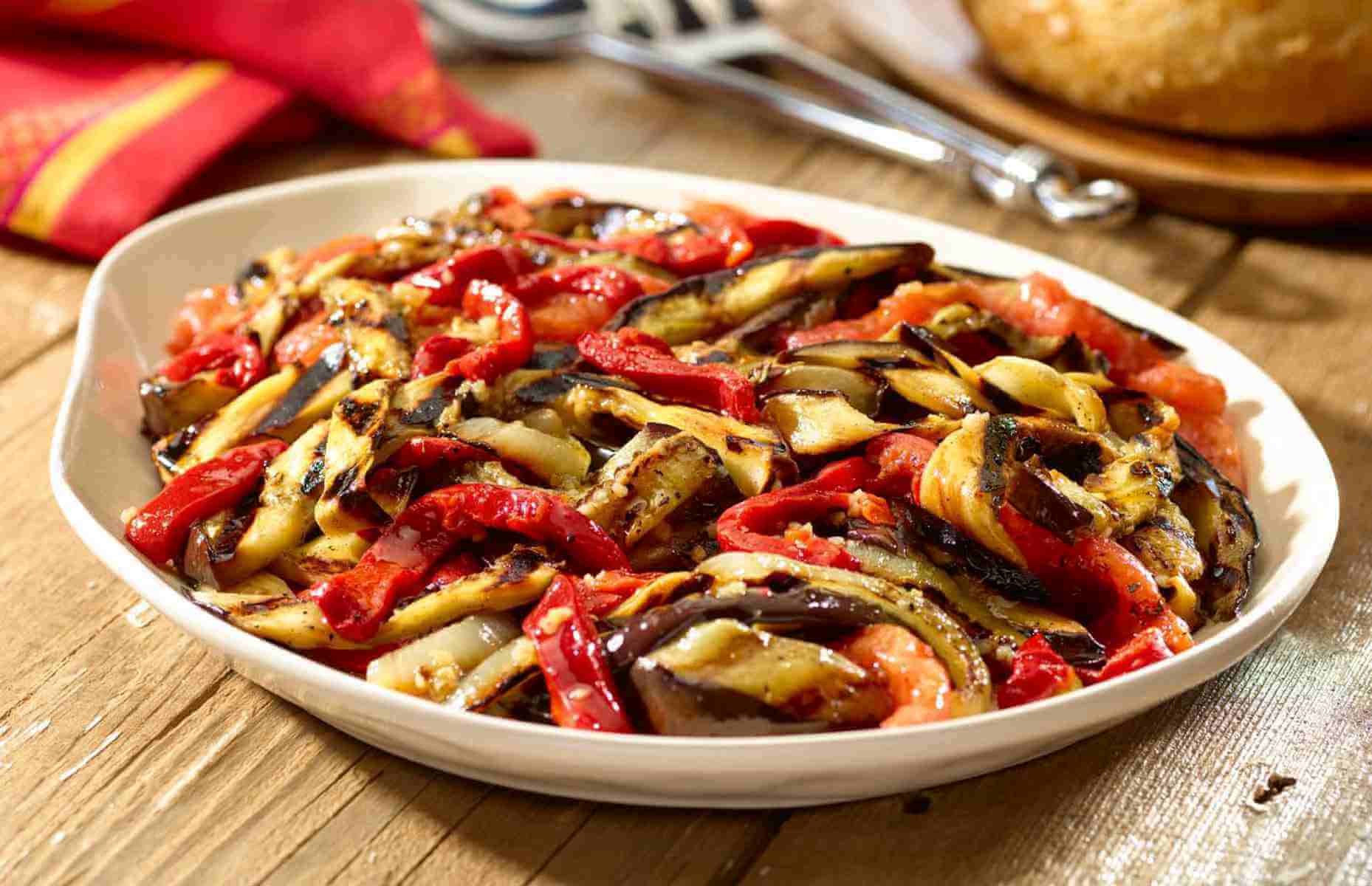 Escalivada - ingredients: eggplant, red bell pepper, onion, garlic, salt, black pepper, olive oil. It can be fried in the oven: