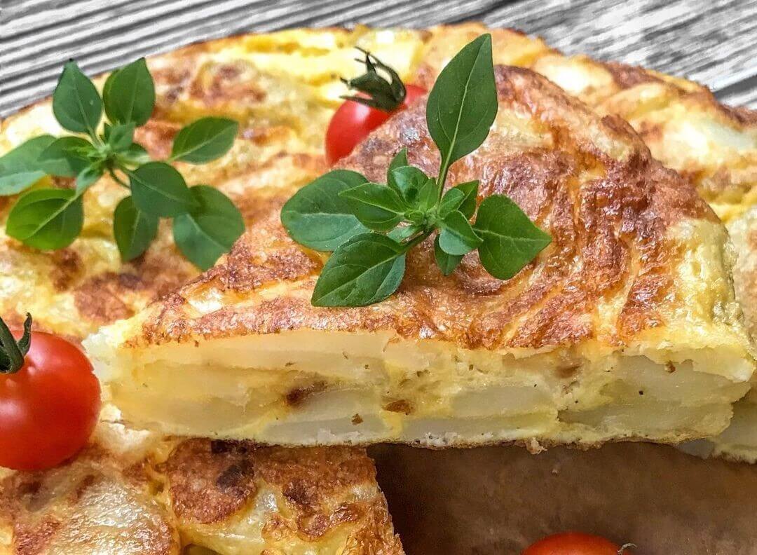 Tortilla de patatas - omelette with potatoes. Ingredients: potatoes, onions, eggs, olive oil, salt, pepper: