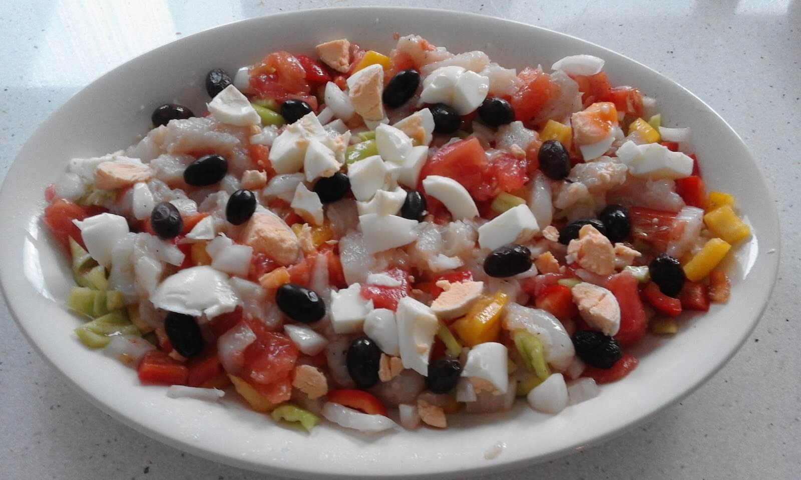 Esqueixada de bacallà - salad, the main ingredient of which is salted cod. It also contains finely chopped tomatoes, onions, red peppers and black olives. Add Romesco sauce (almonds, garlic, hot peppers and tomatoes):