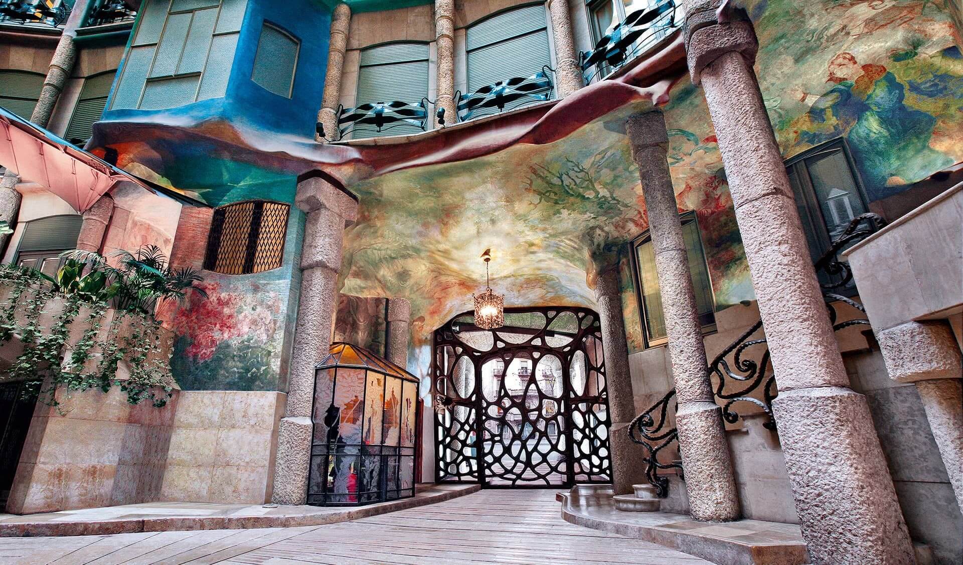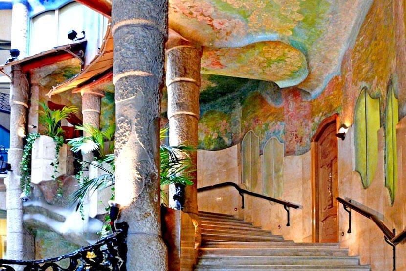 Special mention should be made of the relief railings on the balconies, which Gaudí asked Jujol, with whom he often collaborated, to make. The walls are decorated with artistic frescoes on themes of nature and mythology, the stairs are decorated with relief railings.
