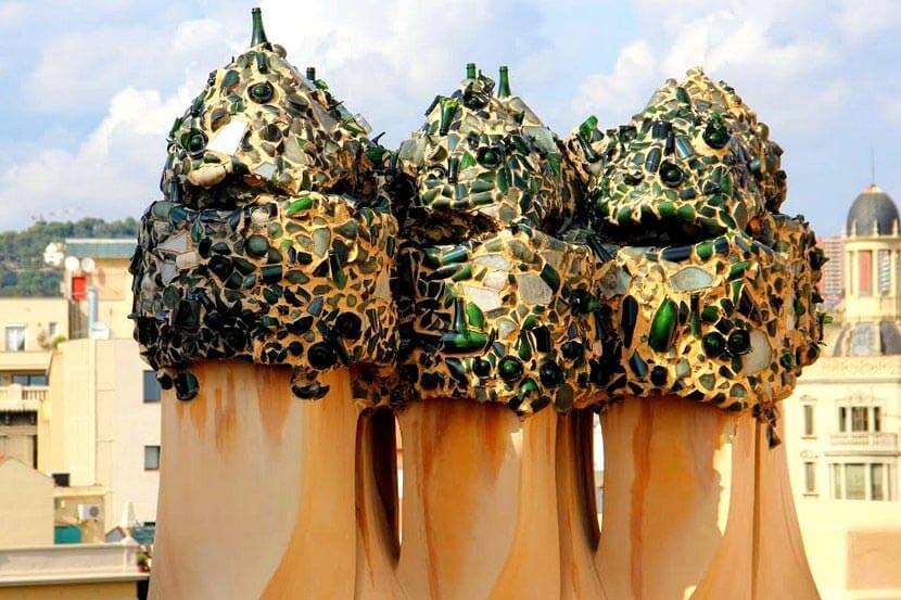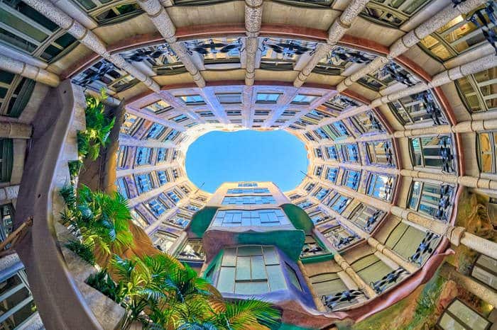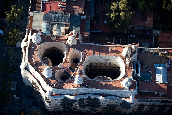 Casa Mila was built between 1906 and 1910 for an extravagant couple, noted for their noisy parties, for which Gaudí made innovative decisions. He drew inspiration from nature and took rocks and mountains surrounded by the sea as his prototype. As with most of his projects, Gaudí added three courtyards to the house to allow light to illuminate every part of the building. One courtyard is shaped like a circle, two are shaped like an ellipse. Auxiliary storage rooms face the courtyard, and the living rooms face the avenue.