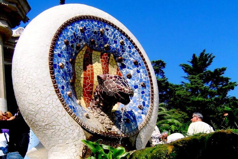 As you enter the park, you will find yourself in a small square where the main staircase begins. It is decorated with fountains, a mosaic medallion with the head of a snake and the flag of Catalonia, as well as a huge salamander ( symbol of fire and Gaudi's favorite aquatic animal). Above the salamander you will see the mystical holy stone - omphalos - a symbol of the center of the universe.