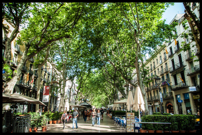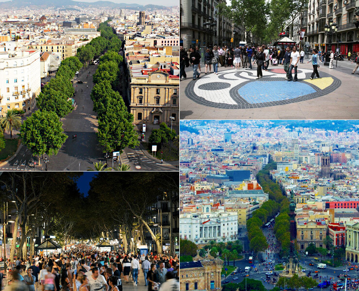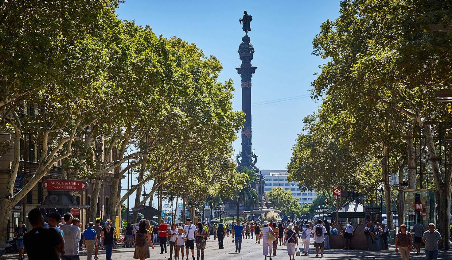 The length of the boulevard is 1200 meters. It starts from Plaça Catalunya, runs between Raval and Gothic Quarter and ends at the monument to Christopher Columbus.