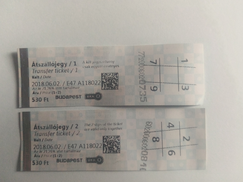 Single ticket with the right to transfer (transfer ticket) - this ticket allows you to use two types of public transport. For example, if you are at the airport, you first take the bus and then the metro (within the same line). Ticket price 530 forints. Below you can see just such a transfer ticket, or rather, 2 pieces. Compost the first one in the first type of transport and be sure to save it, and the second one - in the second one.
