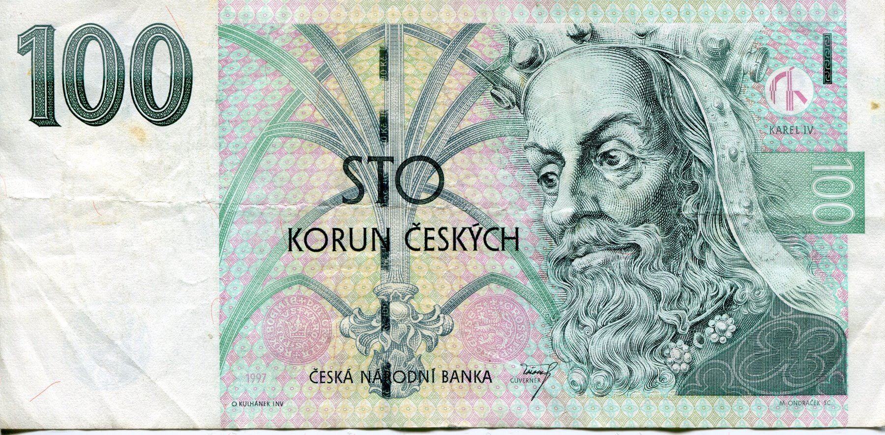The front side of the 100 crown banknote depicts Charles (Karel) IV Luxembourg - King of Germany and Bohemia, Emperor of the Holy Roman Empire in the 14th century.