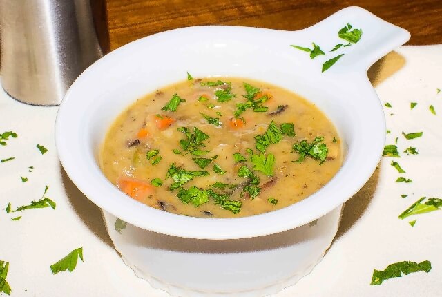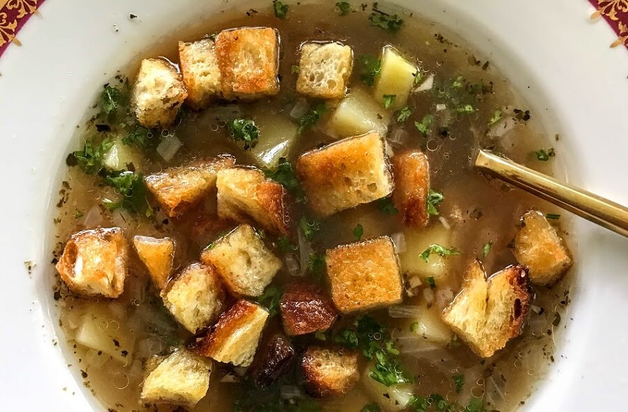 Česnečka (garlic soup) (Česnečka polevka) is a traditional Czech soup. In restaurants it is prepared with bread or potatoes. It contains the following ingredients: pork, potatoes, bread, eggs, buns, garlic, ground black pepper, onion. This is what it looks like: