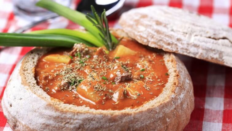 Soup in bread (Polévka v chlebu) is a Czech brand. Freshly baked warm grey bread is cut as if its roof. Then the heart is removed and left 8 cm thick. You can pour garlic, potato, mushroom, onion soup or goulash inside, but it is desirable that it is thick enough so that it does not leak. This is what it looks like: