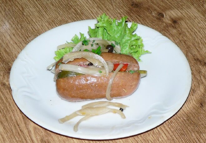 Fried sausage (Klobása) - can be of different types - liver, meat, etc. Hot and crispy sausage in Czech pubs is eaten with hands and dipped in mustard. Ingredients: sausage, tomato paste, ketchup, mustard, garlic, pepper, salt, water: