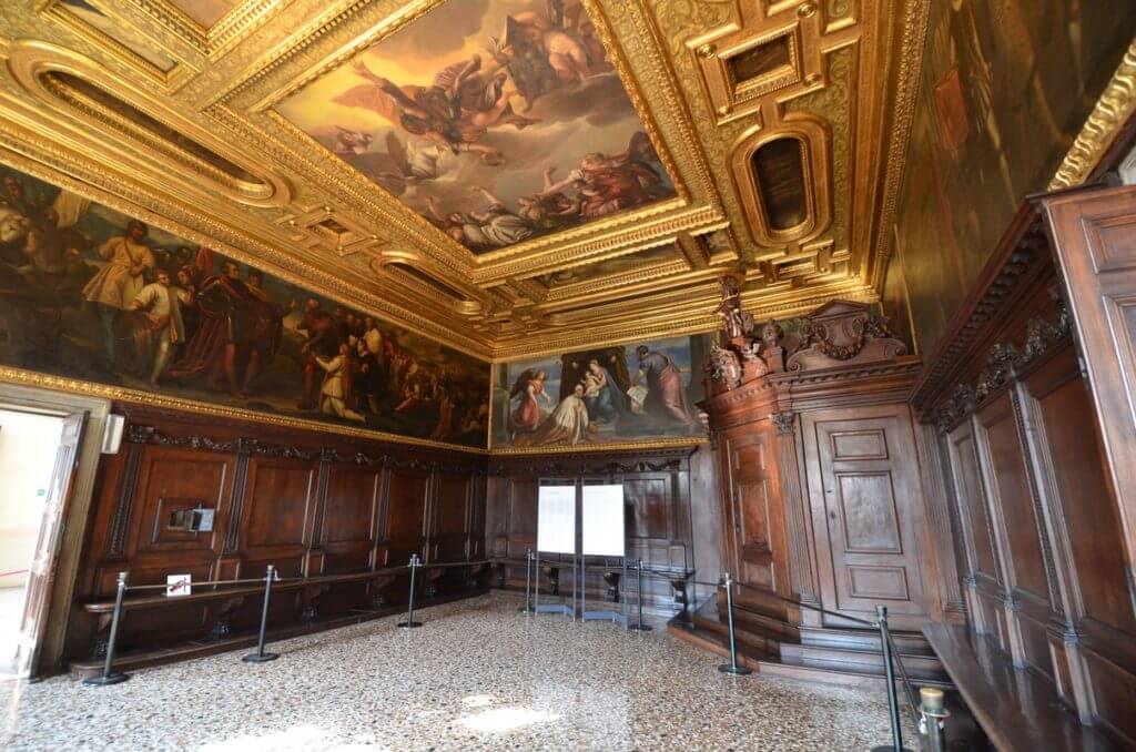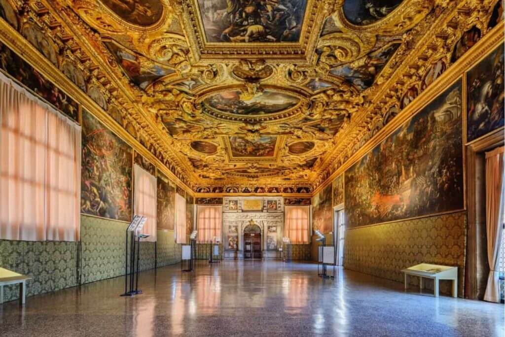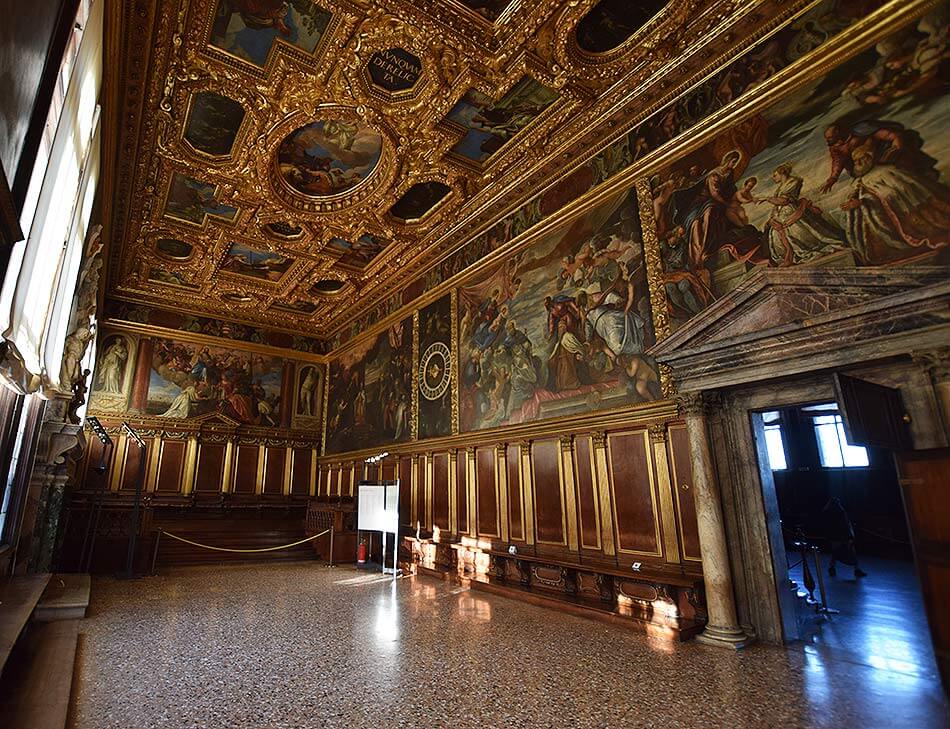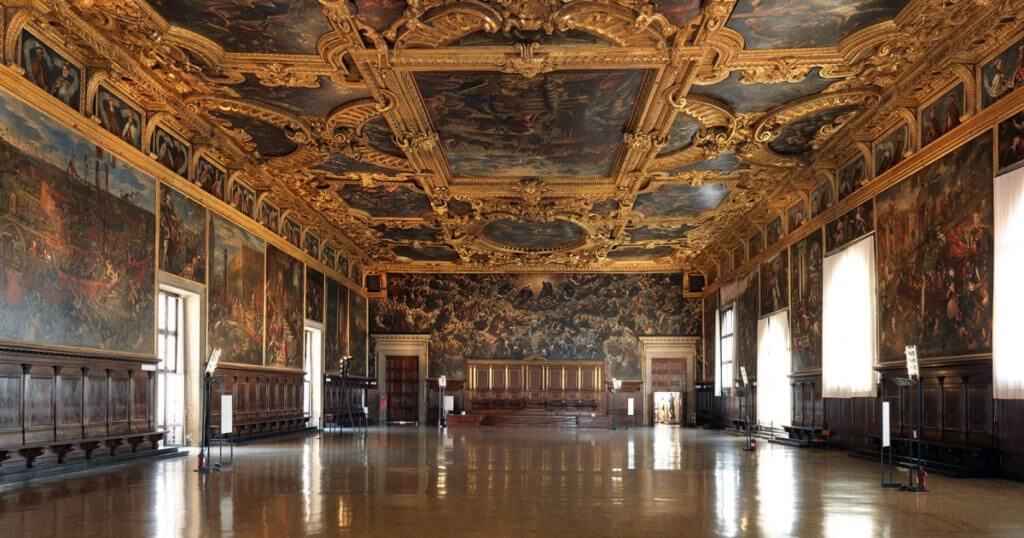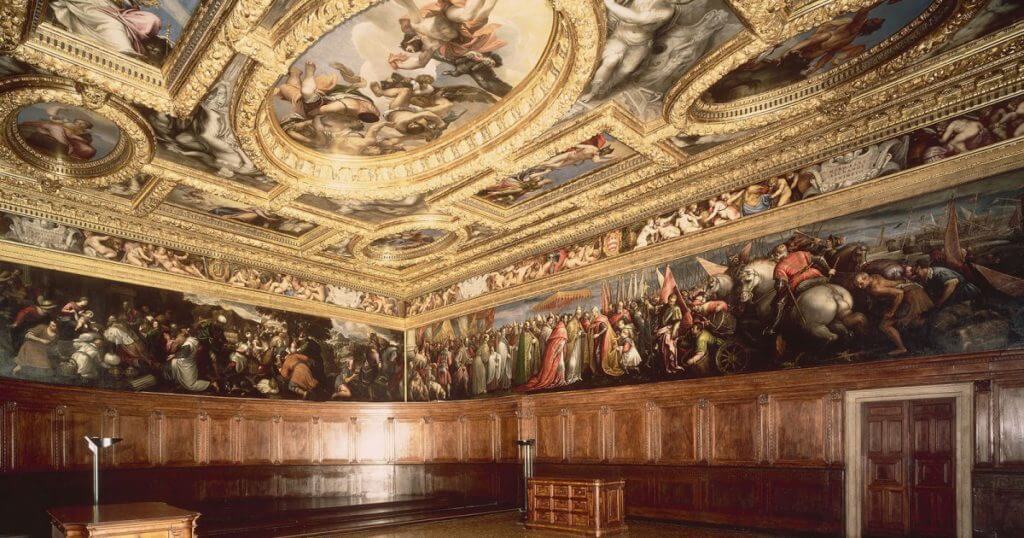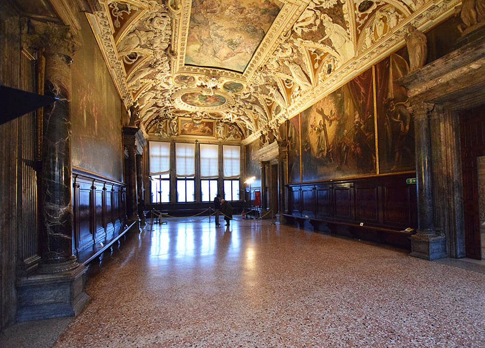 The hall was painted by the greatest artists of their time - Pisanello, Bellini, Carpaccio and Titian. But a fire in 1577 destroyed most of their works. The new hall was painted by Tintoretto, Veronese, Palma the Younger and Francesco Bassano. One of the masterpieces of the hall is Veronese’s painting “The Triumph of Venice.”