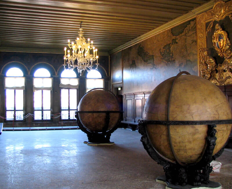 The Hall of the Arms (Sala dello Scudo) is part of the Doge's apartments. Here the ruler of the city-state received guests of the palace. His family coat of arms hung on the central wall. The hall is decorated with two ancient globes and huge geographical maps: