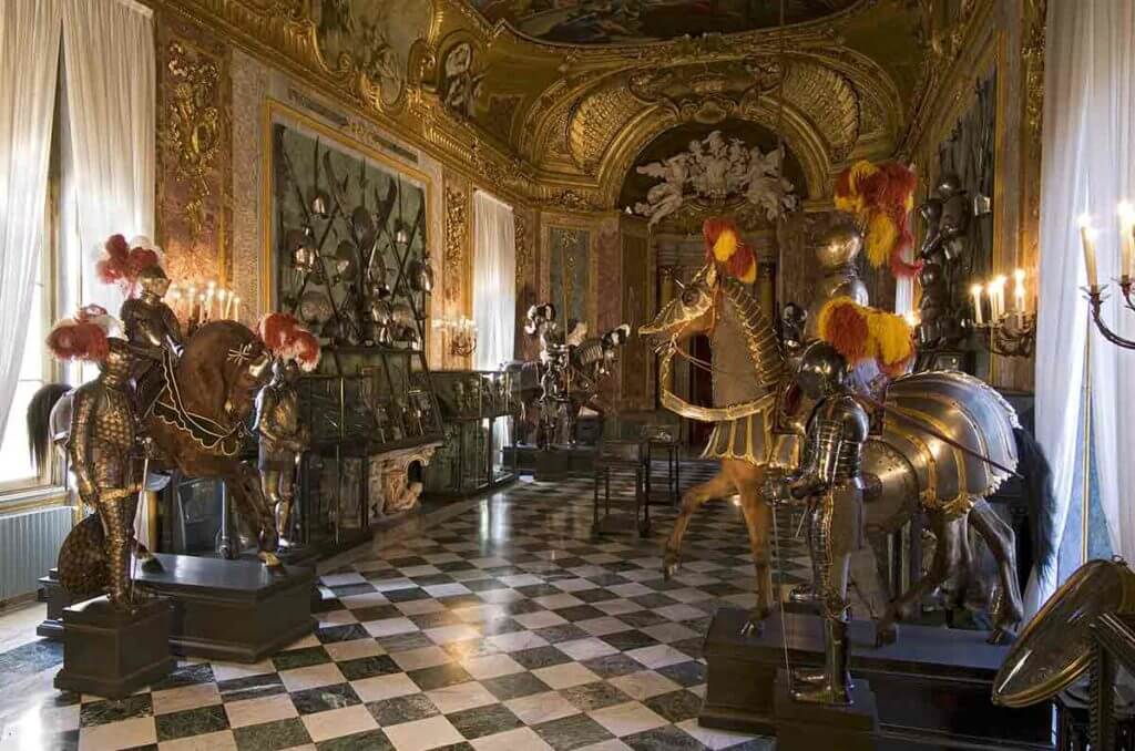 It is worth noting the “Hall of four doors” (Sala delle Quattro Porte). Here, each door is decorated with a rare type of marble and decorated with statues:
