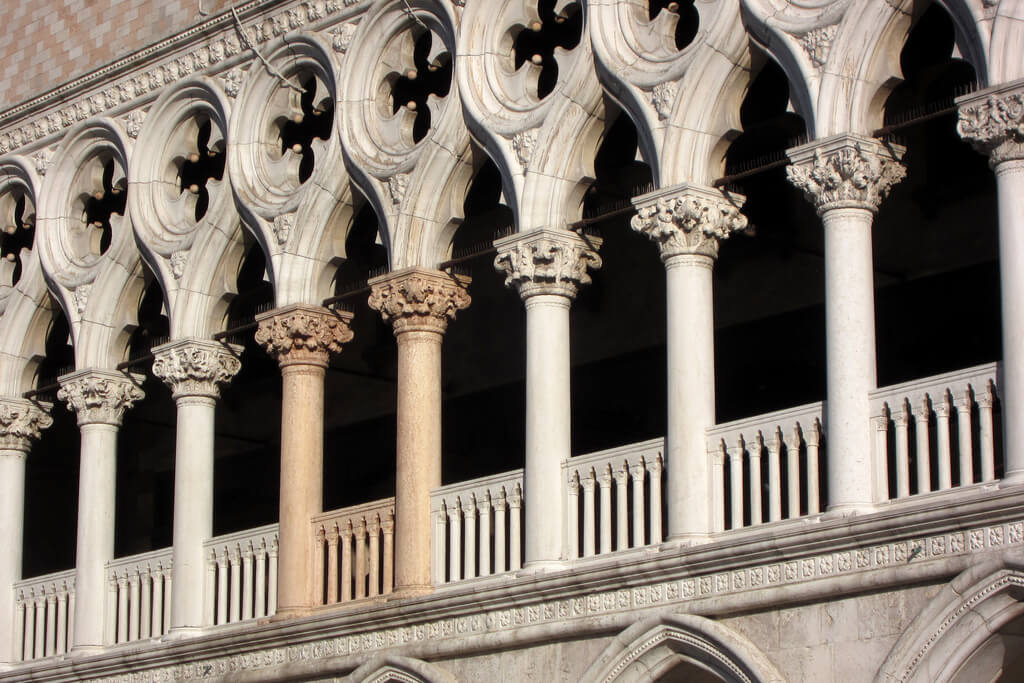 The special appearance of this masterpiece of Gothic architecture is due to the way its creators managed to place this gigantic single mass on thin curved arches of Istrian marble. They achieved visual balance and created surprisingly light upper floors - they cut out arched windows and clad the walls in Verona pink marble. The effect is enhanced by the jagged spire cornice at the top of the building - the palace seems to float in the air. The massive facade rests on a foundation of wooden beams planted on the bottom of the lagoon.