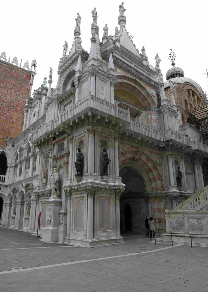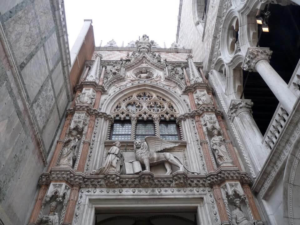 The main entrance to the Doge's Palace is the "Paper Door" (Porta della Carta), which connects it to St. Mark's Basilica (Basilica di San Marco). The door is decorated on all sides with decorative figures, and on the portal Doge Francesco Foscari kneels before the Lion of St. Mark, which is a kind of symbol of the fact that in the Venetian Republic people bowed to power.
