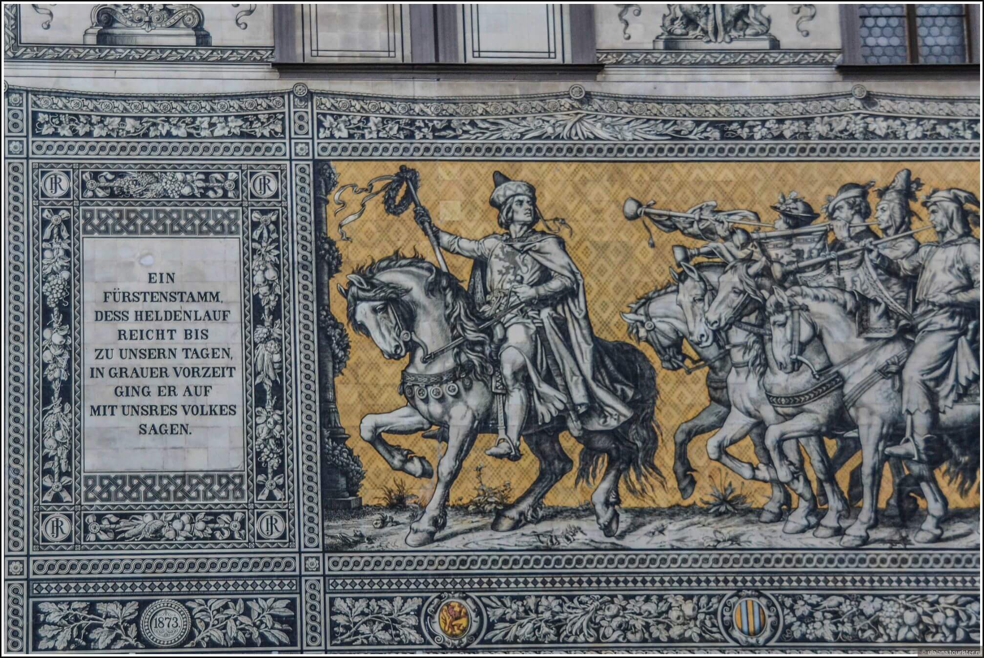 The panel is placed on the outer side of the wall of a long gallery - a former stable yard. Its length is 110 meters, width – 10.5 meters. It consists of the famous Meissen porcelain 20x20 cm. Size 24 thousand tiles. They depict 34 Saxon marquises, dukes, electors (princes in the "Holy Roman Empire" who had the right to choose a king or emperor) and kings of the Wetin line, who ruled the country from 1127-1873. The panel also depicts 59 people: members of the retinue, artisans, warriors, peasants, famous scientists and artists. At the beginning of the procession is Conrad the Great, at the end - Wilhelm Walter, the artist who created the panel.