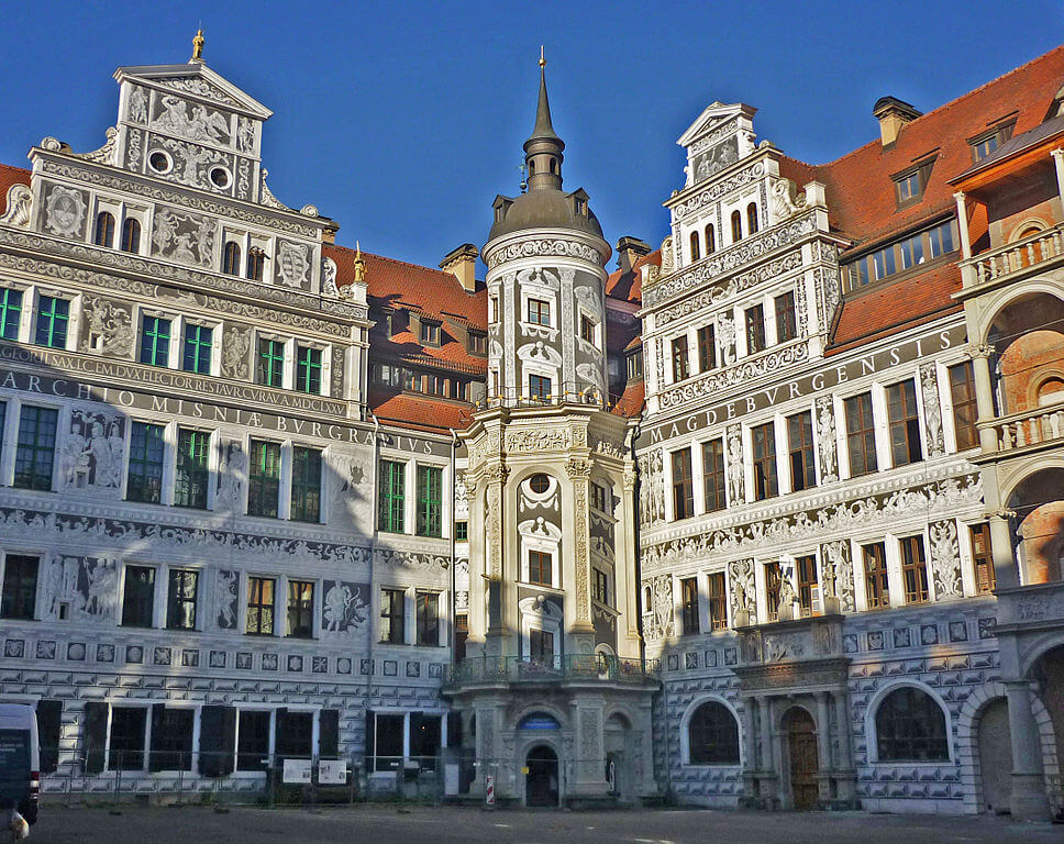 This is one of the oldest buildings in Dresden. Once upon a time the kings and electors of Saxony lived here, and now here are located the Green Chambers (Grünes Gewölbe) and the Armory Hall (Rüstkammer), a cabinet of engravings and sketches of famous artists (Kupferstich-Kabinett) and a museum of coins and awards (Münzkabinett). This is what the residence castle looks like from different angles: