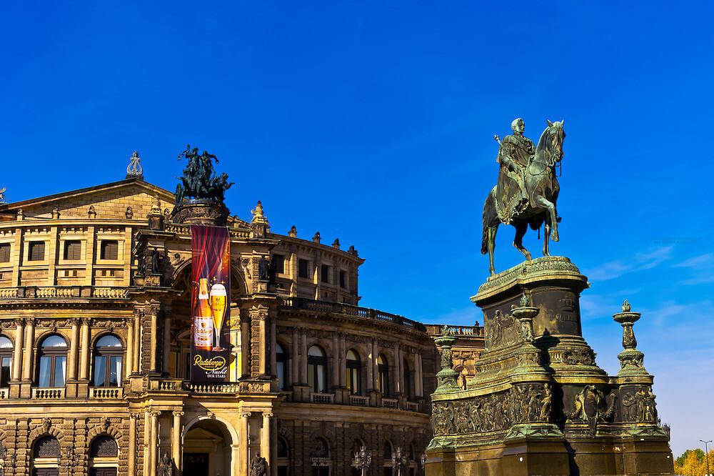 In front of the building there is a statue of King Johann of Saxony on horseback.