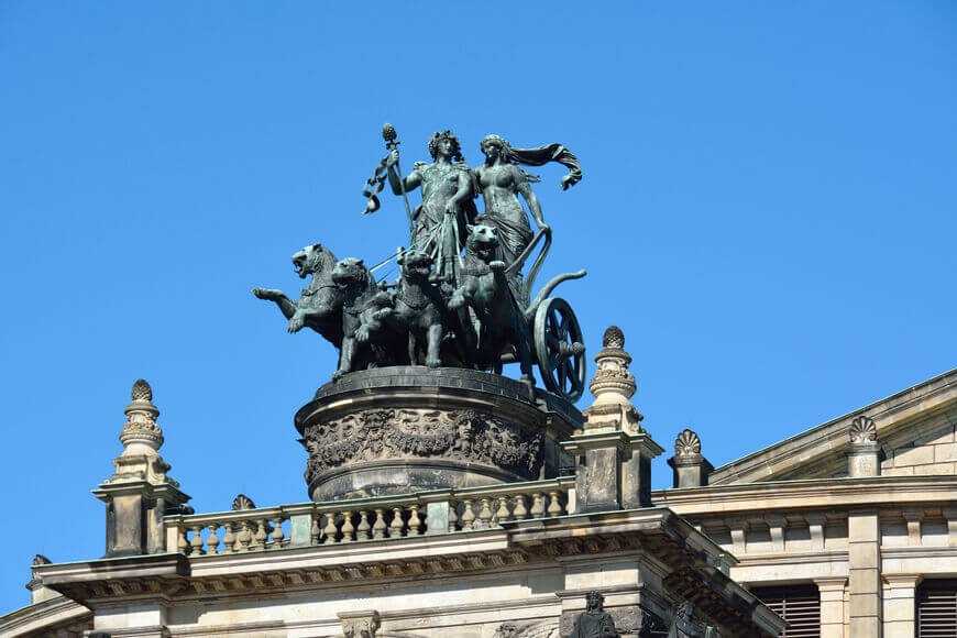At the top of the main entrance was placed a bronze quadriga, harnessed by bronze panthers, and driven by Dionysus and Ariadne. At the entrance to the theater there are statues of Goethe and Schiller, and at the side entrances there are statues of Shakespeare, Sophocles, Moliere and Euripides. The western façade features the coat of arms of Saxony and a bust of Semper.