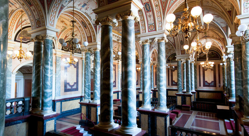 A curtain 12 meters long and 7 meters high weighs 400 kilograms. It was restored exactly according to historical sketches. It depicts busts of poets and philosophers, lyrical compositions and garlands.