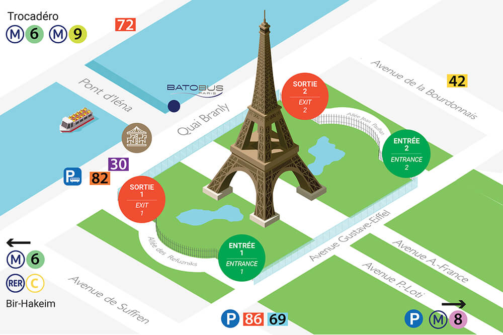 - metro: line 9 (station Trocadéro), line 6 (station Bir Hakeim), line 8 (station Ecole Militaire).