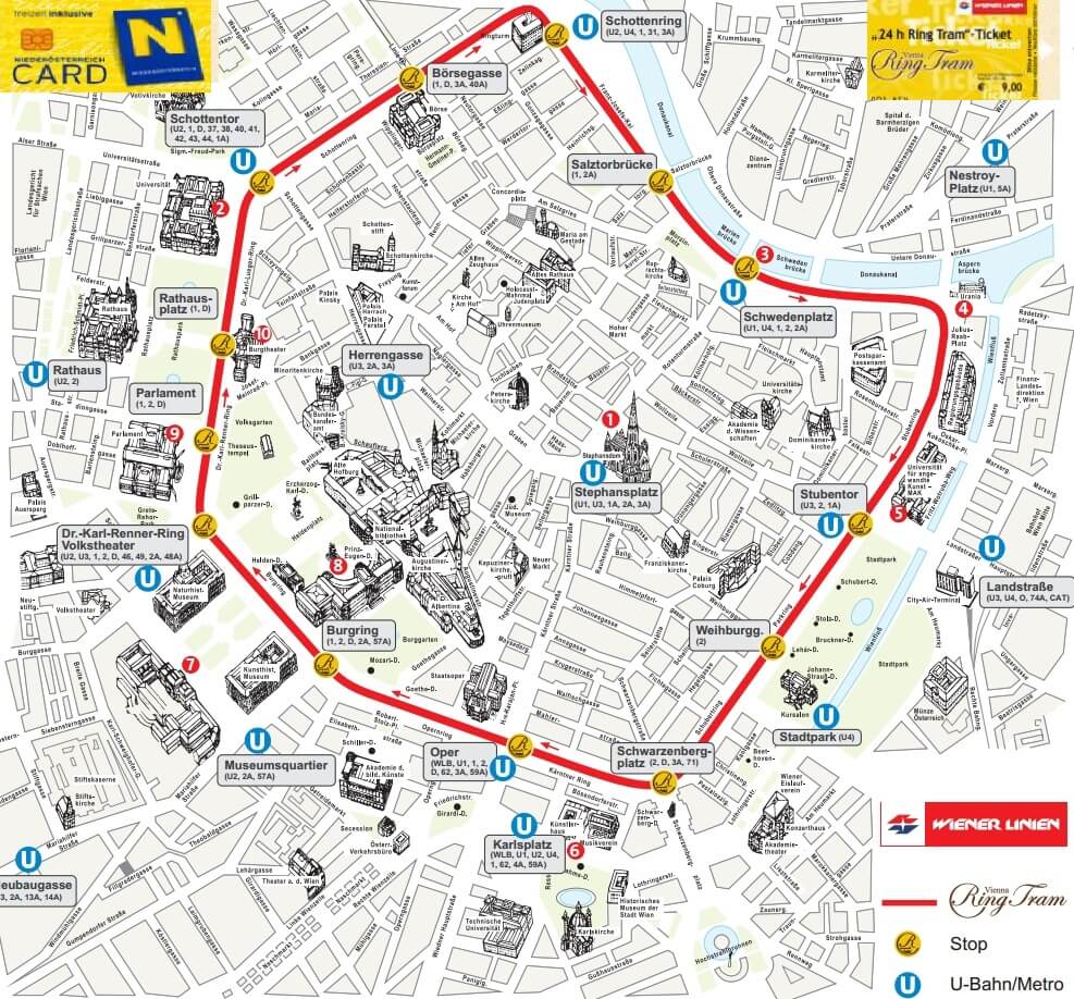 The following attractions await you along the way: Vienna State Opera, Vienna City Hall, Austrian Parliament, University of Vienna, Hofburg Palace, Stock Exchange, Burgtheater, Kunsthistorisches Museum, Museum of Natural Sciences, Volksgarten, Stadtpark and others .