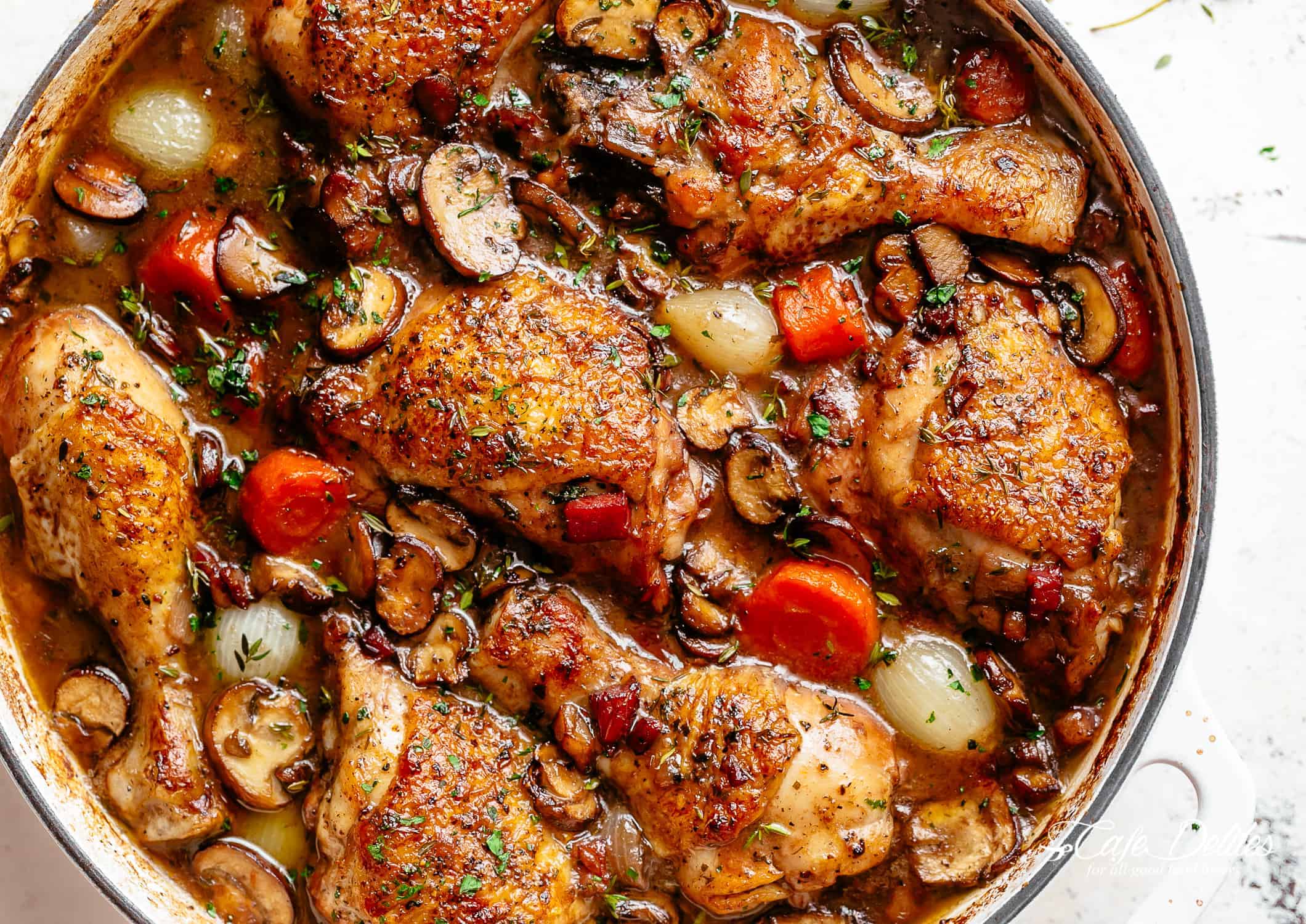 Cockerel in Wine (Coq Au Vin) - a classic French dish made from chicken meat - preferably a one-year-old three-kilogram rooster and Burgundy wine, since the homeland of this dish is Burgundy. Here it is: