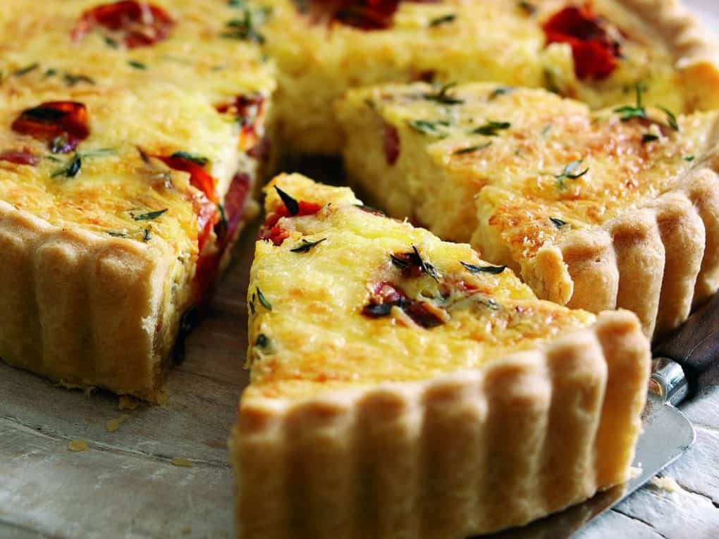 Quiche Lorraine Pie - a classic of French cuisine. This masterpiece is from Lorraine. It includes flour, butter, bacon, eggs, cheese, cream, etc.: