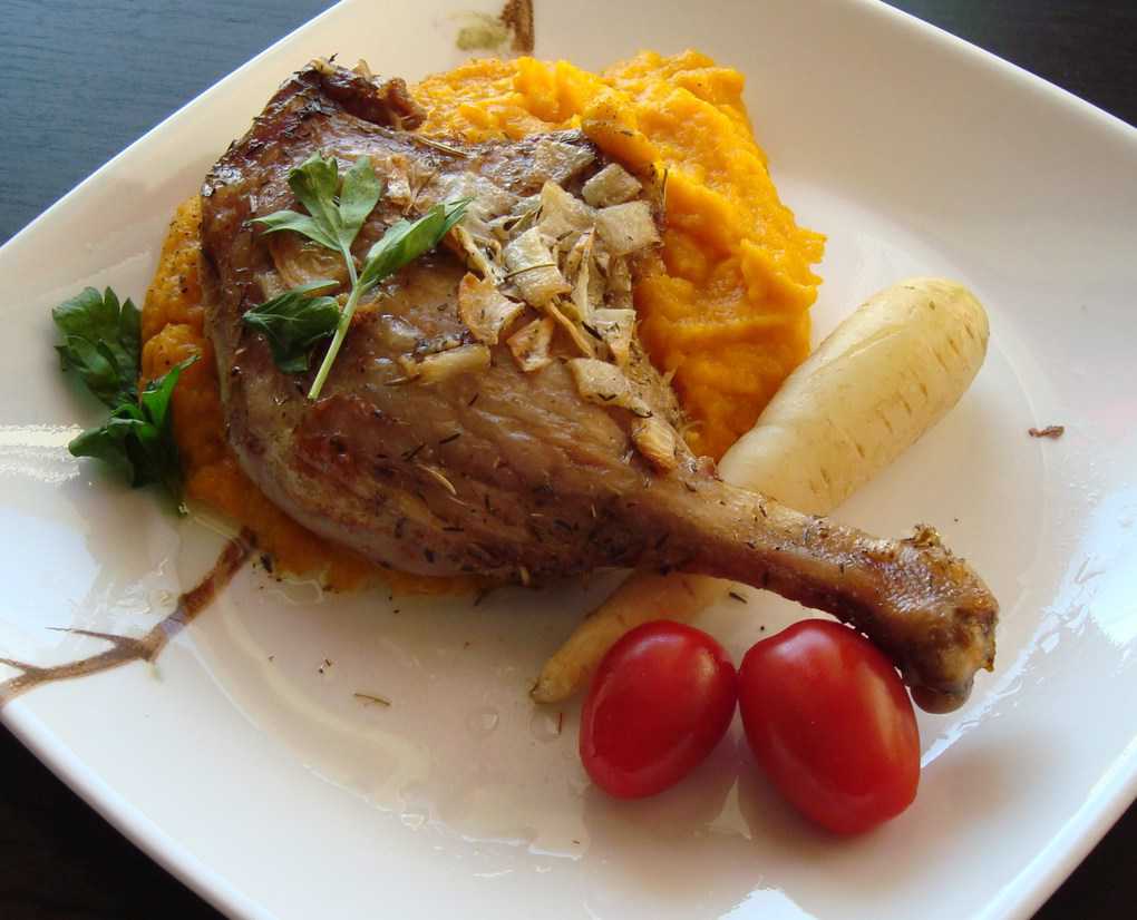 Confit de canard - in the old days, this dish was used mainly for creating reserves. It includes duck breast, duck fat, parsley, bay leaf, black pepper, etc. Instead of duck at home, you can use any other poultry: