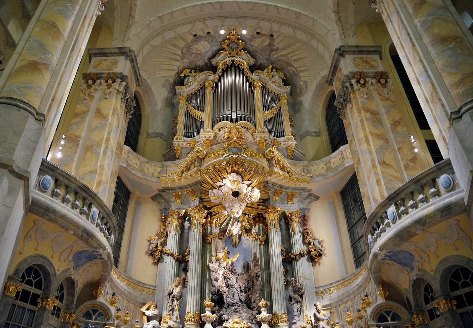 The organ for the Frauenkirche was made by Gottfried Liebermann. Immediately after the opening of the church, Johann Sebastian Bach held concerts on this organ. Unfortunately, during the bombing of 1945 this instrument was completely destroyed. A new body was created in 2005. It is placed above the altar.