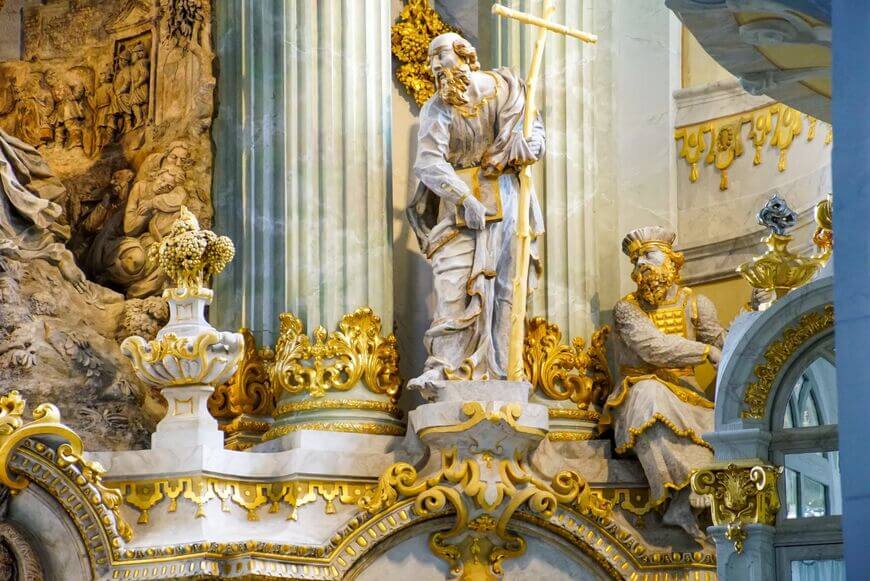 The author of the luxurious gilded altar is Johann Christian Feige. The abundance of carvings and sculpture, as well as the depth of the images, is surprising. In the center is a biblical scene from the Gospel: Jesus prays in the Garden of Gethsemane, his comrades are sleeping nearby, and in the distance soldiers are already visible rushing to arrest Christ.