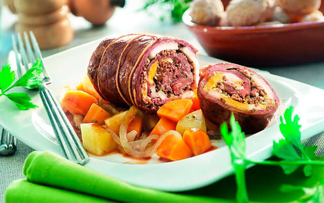 Rinderrouladen - this dish is a beef roll. To prepare it we use: beef, bacon, mustard, onion, a little sour cucumber, broth sauce: