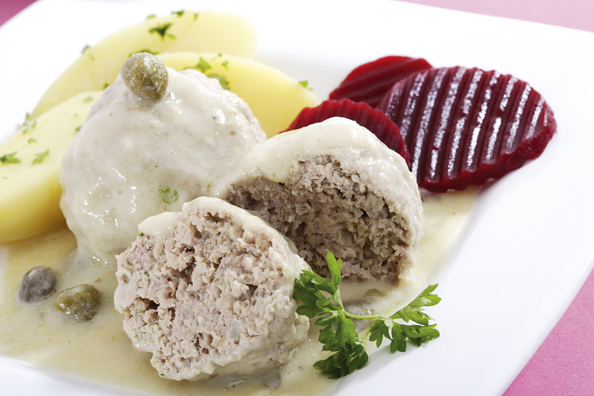 Koenigsberger Klopse - used for cooking: minced veal , bread, anchovies, eggs, potatoes, lemon juice, mustard, white wine: