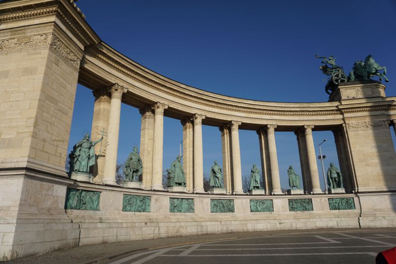 In the 85-meter colonnades there are statues of Hungarian nobles of different dynasties. From the Arpad dynasty: Saint Stephen, Saint Laszlo, Kalman I “the scribe”, Andras II, Bela IV; From the Angevin dynasty: Charles Robert, Louis I "the Great", Janos Hunyadi, Matthias Corvinus; Transylvanians: Istvan Bocskay, Gabor Batlen, Imre Tekel and Ferenc II Rakoc. Finally, the famous Hungarian figure, fighter for the liberation of the people Lajos Kossuth.