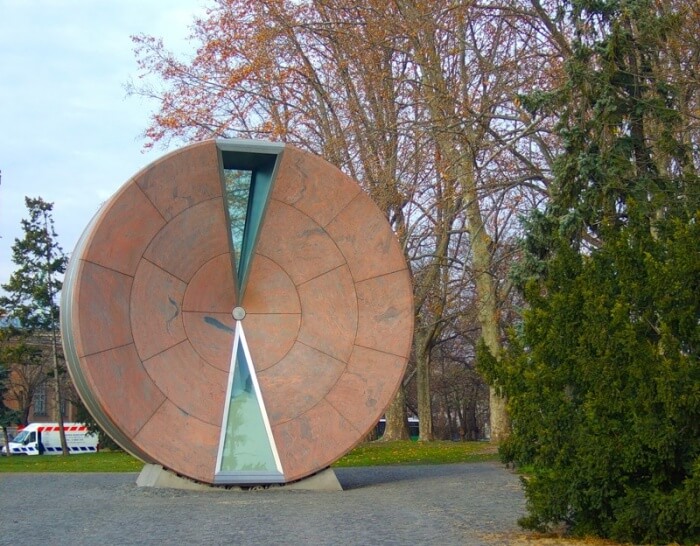 The Wheel of Time is a huge hourglass. It was installed next to Heroes' Square in 2004 to celebrate Hungary's accession to the European Union. Once a year, on December 31, the wheel rotates 180 degrees and sand is thrown from one triangle to another.