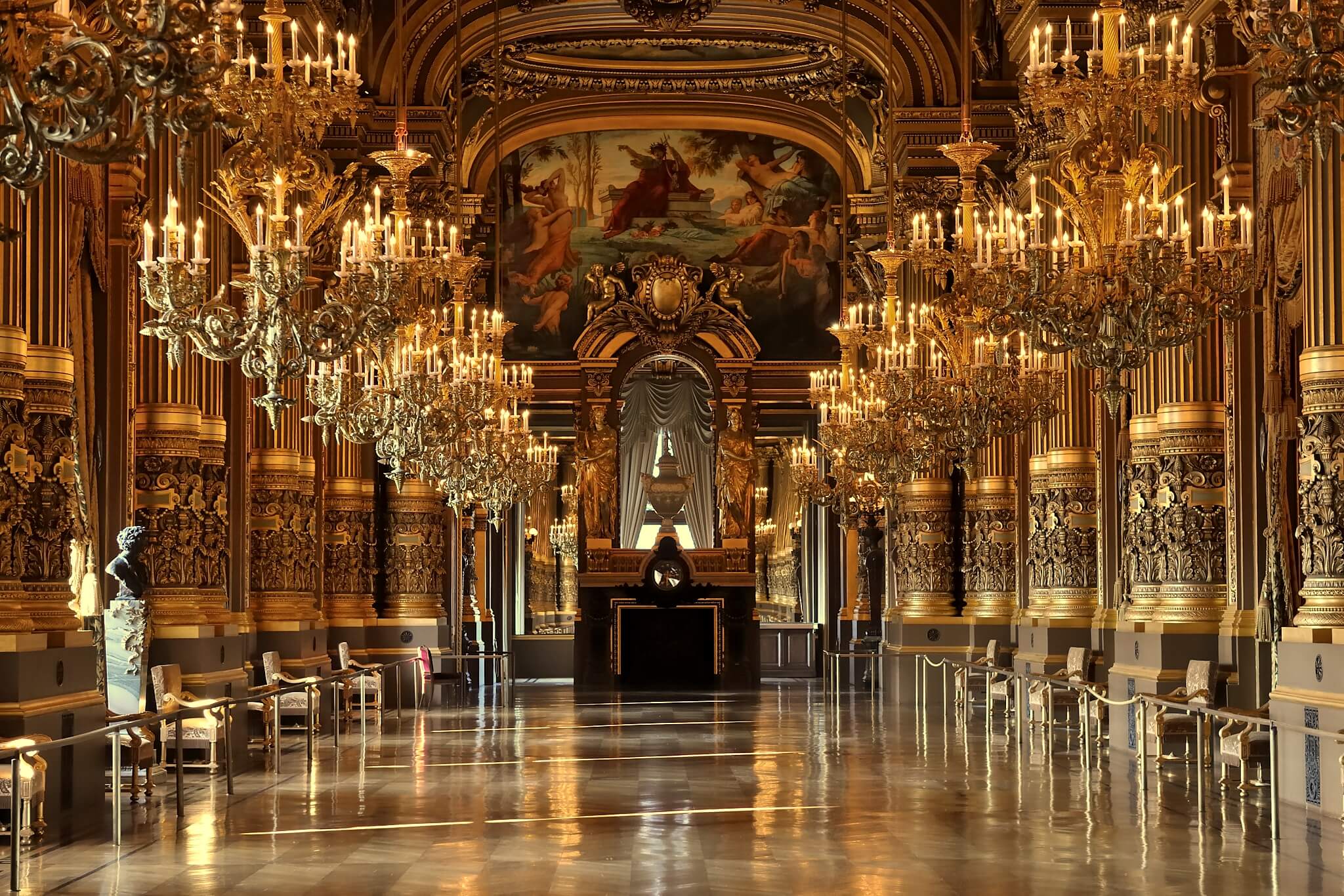 The ceilings of the large foyer are 18 meters high, 54 meters long and 13 meters wide. The vault is covered with mosaics. Mirrors make the already large space even larger. The main element is the lyre. They are not only on the ceiling, but also on the walls and even on the door handles. In the center of the lobby there is a copy of the bust of the architect Charles Garnier.