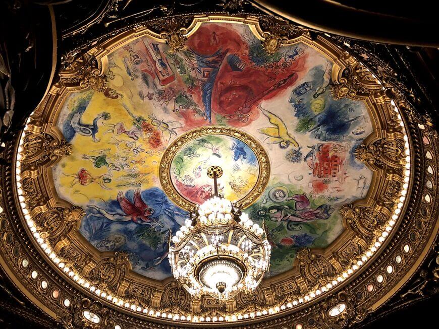 The Grand Opera has a unique ceiling. As we mentioned above, it was painted by Marc Chagall, divided into five sectors and depicted scenes from several classical operas and ballets. Here are characters from the operas of Beethoven, Verdi and Gluck, as well as the main attractions of Paris - the Arc de Triomphe, the Eiffel Tower, the Palais Bourbon and the Opera Garnier.