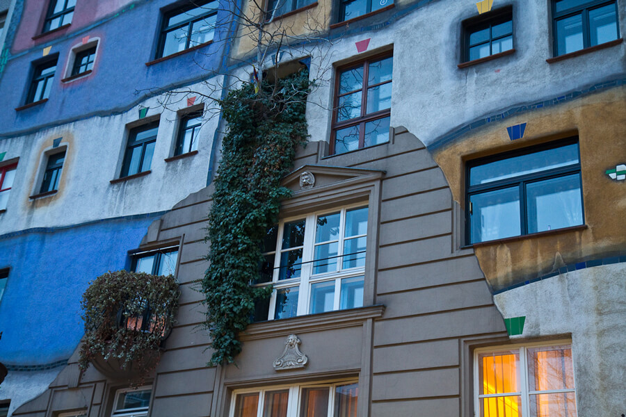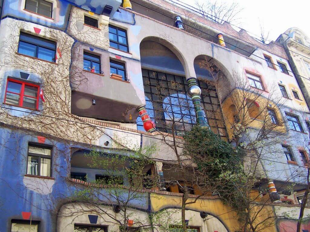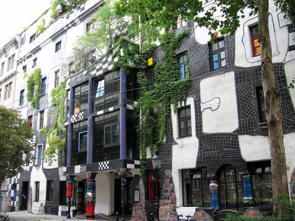 Hundertwasser's theory is most clearly represented by his house, covered with trees and plants. Inside the building there are multi-level floors, rounded corners and uneven stairs.