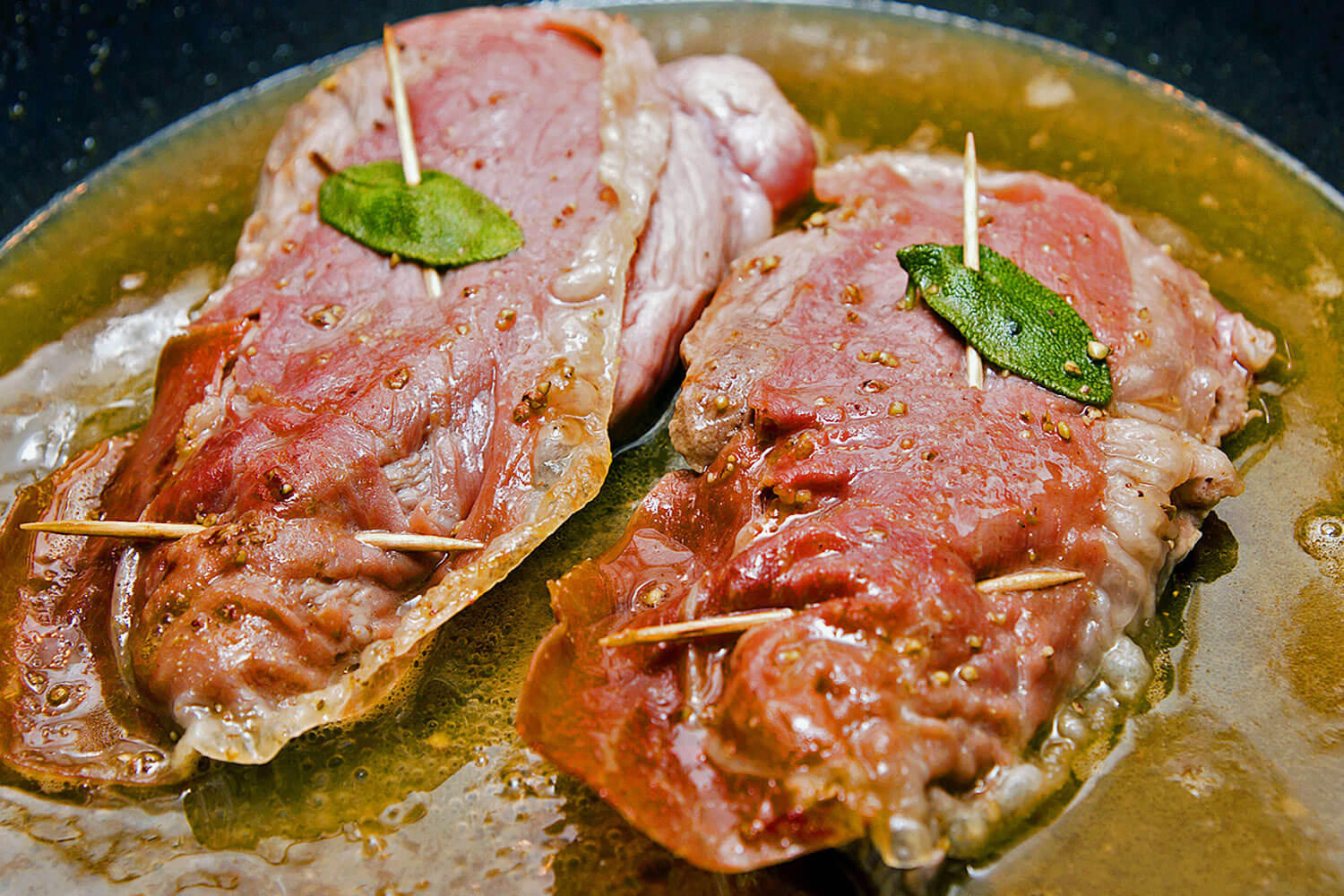 Saltimbocca alla Romana — Ingredients: veal, prosciutto, sage, butter, olive oil, dry white wine, flour, salt, black pepper: