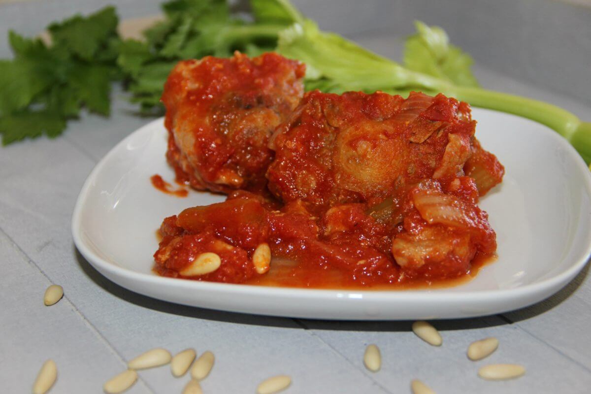 Coda alla vaccinara — Ingredients: oxtail, bacon, olive oil, celery, cloves, garlic, carrot, onion, bay leaf, tomato paste, dry red wine, nutmeg, black pepper, cinnamon: