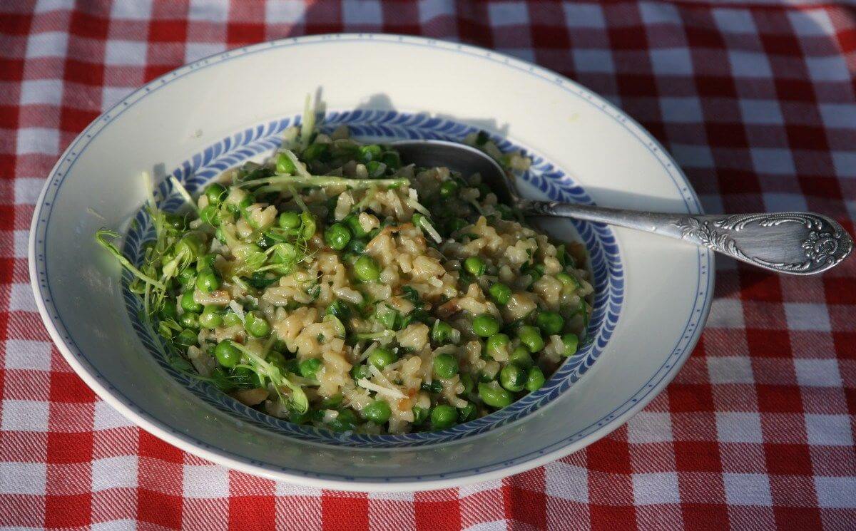Rizi e bizi - this is rice and peas , but not grains, but pea pods. Add chicken broth, Parmesan, olive oil. It's very tasty: