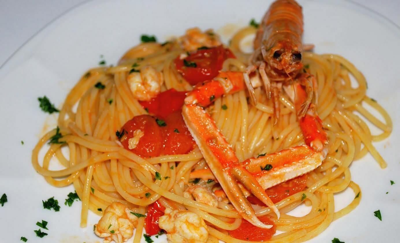 Scampi a la buzara is spaghetti with shrimp and tomato sauce: