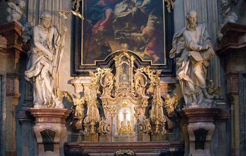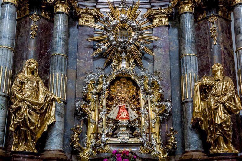 The temple houses one of the shrines of the Czech Republic – the Esulatko of Prague. The statue of the newborn Jesus looks at all visitors. Whether it fulfills wishes can be determined by the numerous inscriptions of gratitude on the side of the altar.
