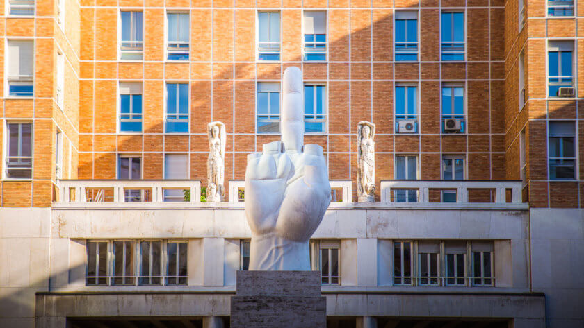 The statue is located about 800 meters from the Duomo, in front of the headquarters of the stock exchange, and protests against gambling in the financial affairs of the city. L.O.V.E. means: liberta, odio, vendetta, eternita (freedom, hatred, revenge, eternity).
