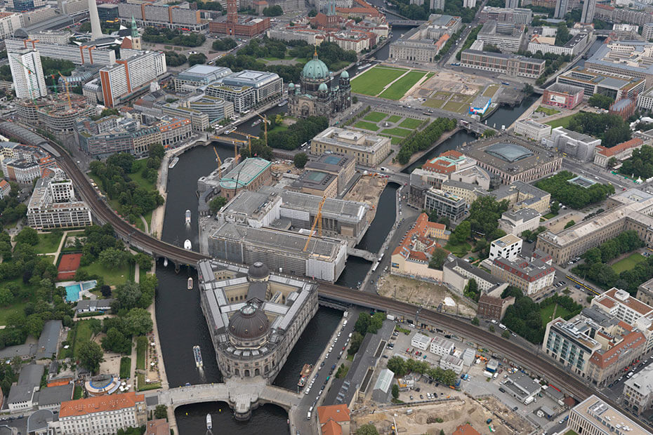 The northern end of the “Museum Island” is crossed by the Monbijou Bridge, which connects the island with both banks of the Spree. Both bridges are closed to public traffic and form the entrance to the Bode Museum, a triangular neo-Baroque building whose huge dome dominates the northern part of the Spreinsel.