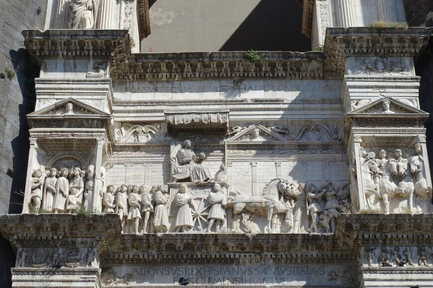 Castel Nuovo fortress attracts the visitor's attention, first of all, with its architecture. The foundation of the building in the Gothic style has a trapezoidal shape. Here and there in the arch and in other corners of the building there are 5 round towers 55 meters high, and on the main facade you can see three towers: St. George, the middle one and the watchtower. Between the middle and watchtowers there is a triumphal arch, which was built during the reign of King Alfonso V of Aragon in 1470 during the next strengthening of the fortress. It is a striking example of the Renaissance, and the bas-reliefs and statues depict the king's triumphal entry into Naples.